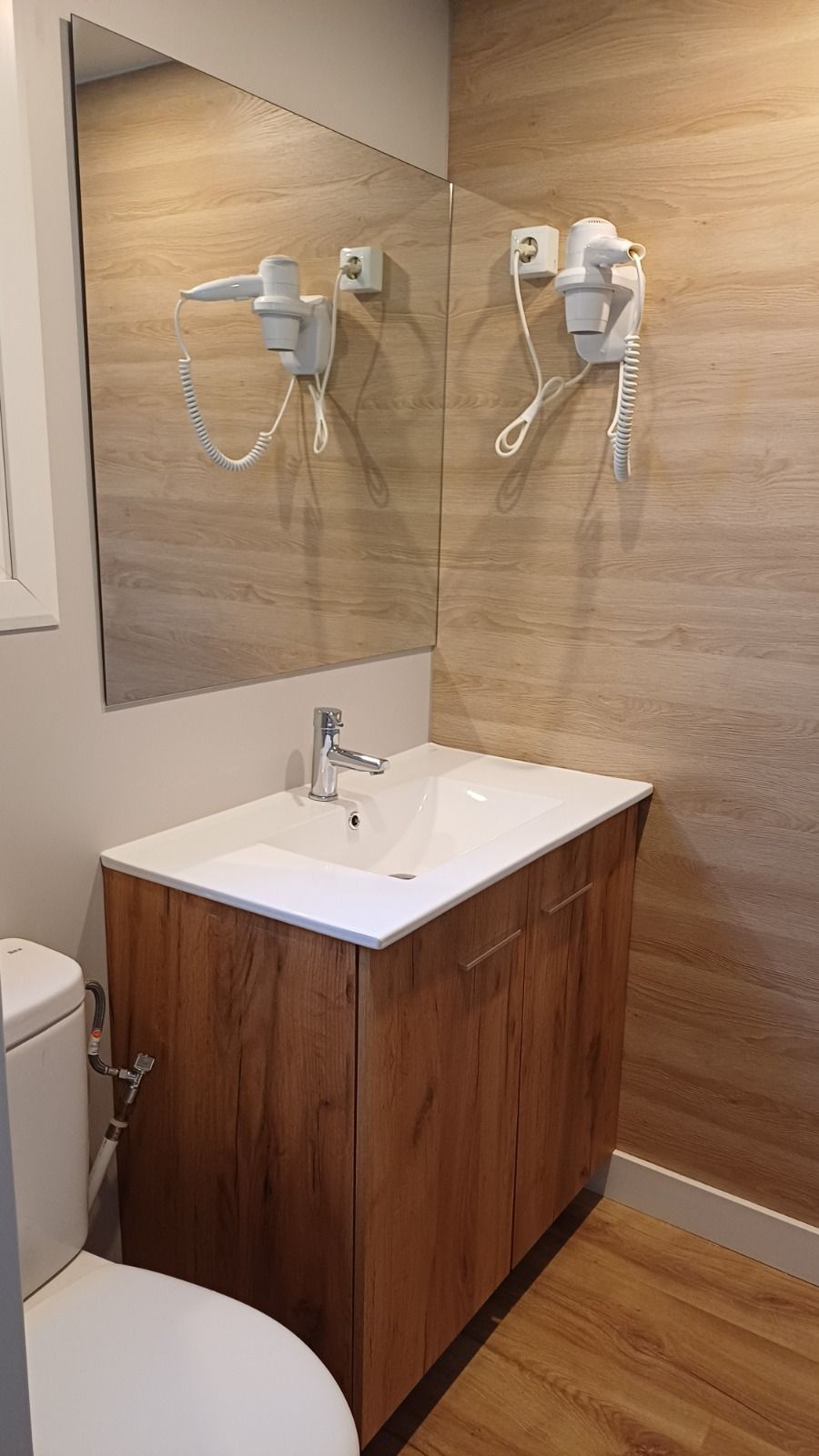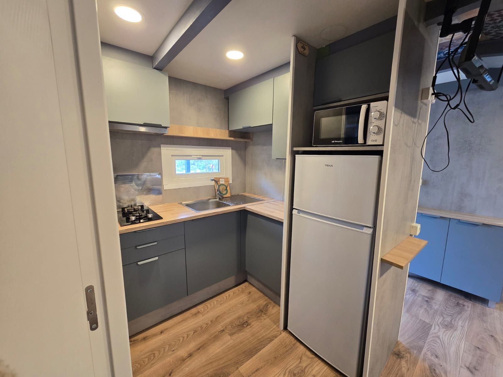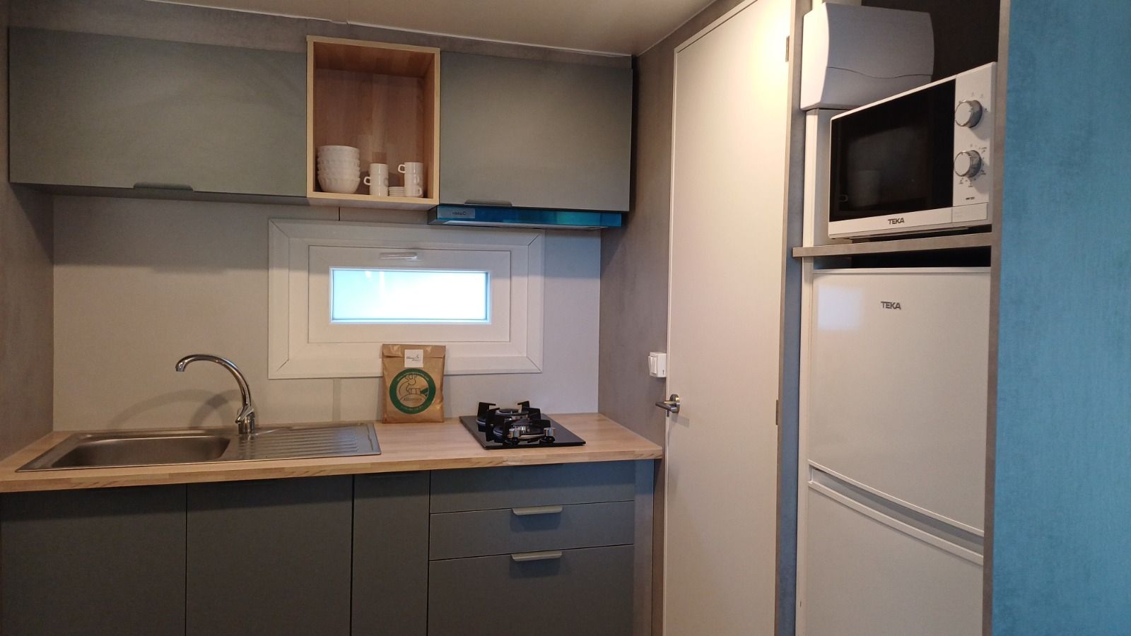 Open plan accommodation with double bed, sofa, TV, air conditioning, heating and blankets. Outdoor kitchen with two hotplates, refrigerator, microwave and coffee maker. Common barbecue area nearby. Sheets and towels not included (rental option).